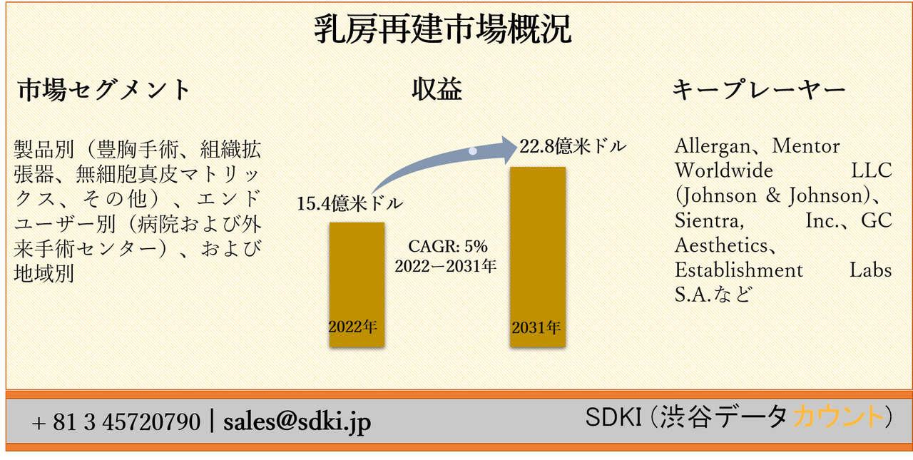 乳房再建市場は、2022年に15.4億米ドルの市場価値から、2031年までに22.8億米ドルに達すると推定され、2022-2031年の予測期間中に5%のCAGRで成長すると予想されています。